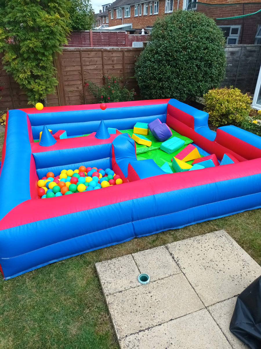 Includes: This is our 10ft x 10ft Soft Play surround, a perfect way of keeping your littles safe and contained while enjoying our range of 17 soft play shapes and air juggler ball pit. Plus 4 ride on cars.